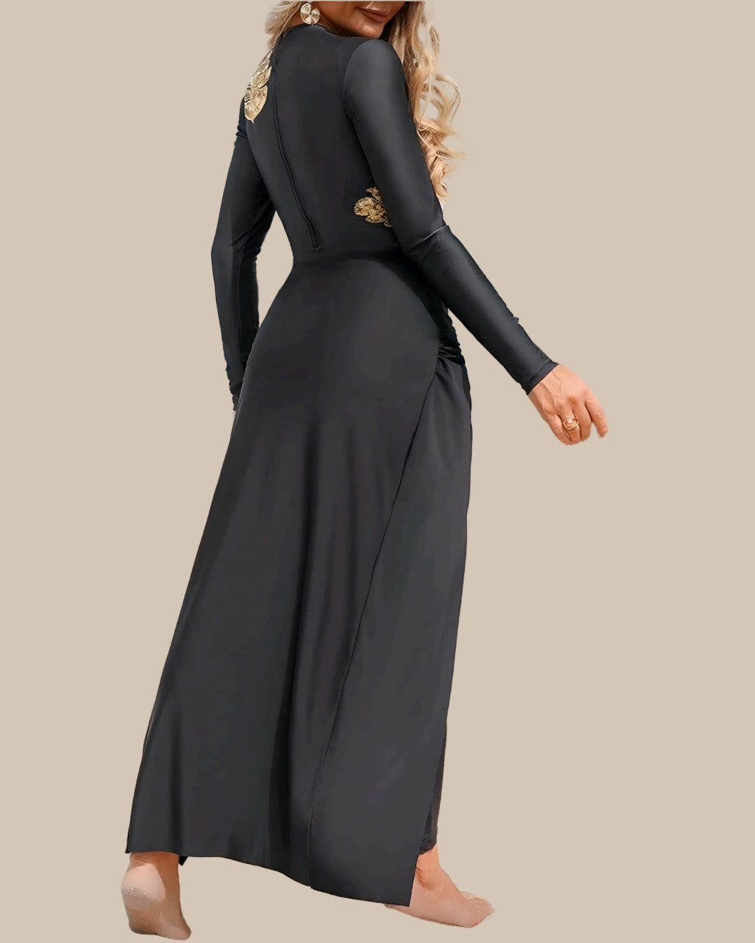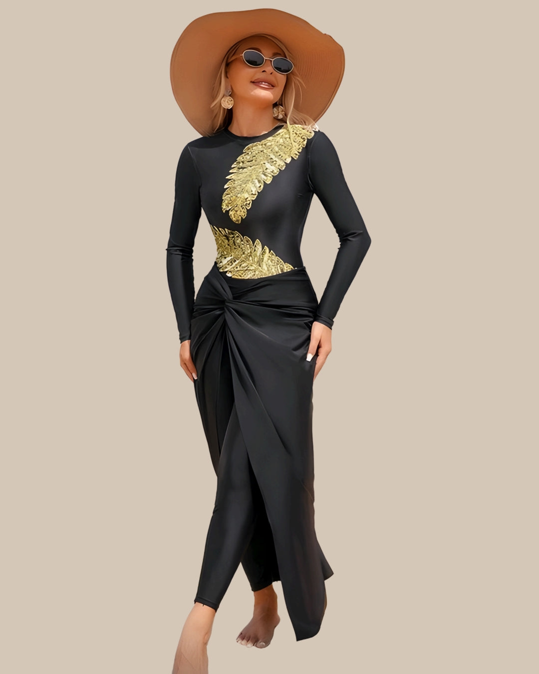 Make waves in timeless style with our Golden Tide 3-Piece Modest Swim Set. Featuring a sleek black design adorned with golden leaf detailing, this set exudes sophistication and confidence. The wrap-style skirt adds graceful coverage, while the fitted inner leggings and top provide comfort and support. Perfect for beach getaways, pool days, or luxury resort escapes.