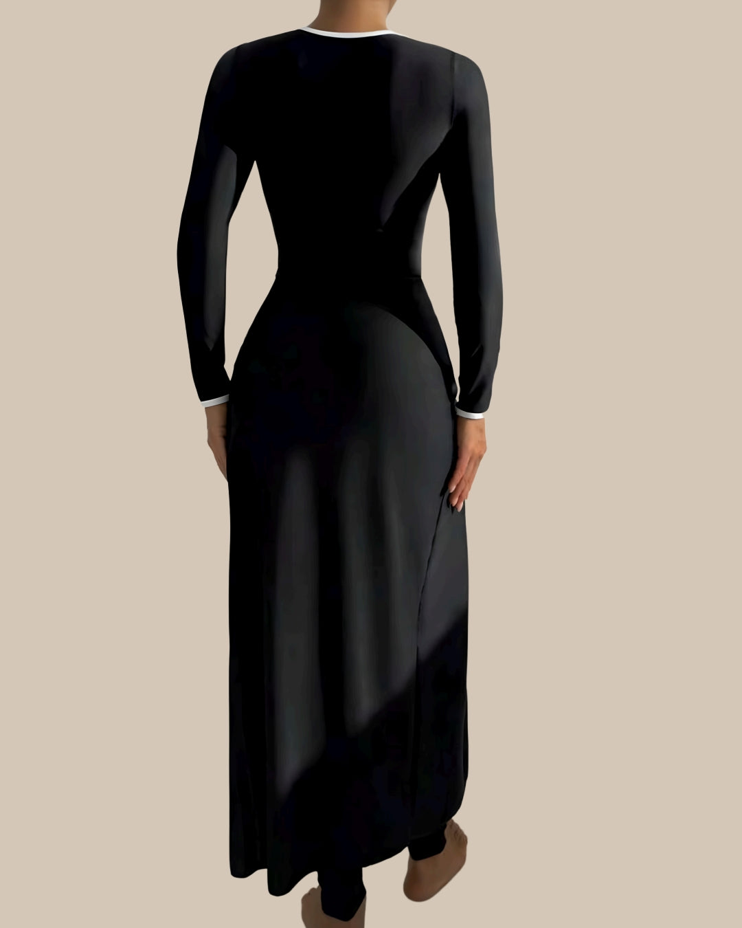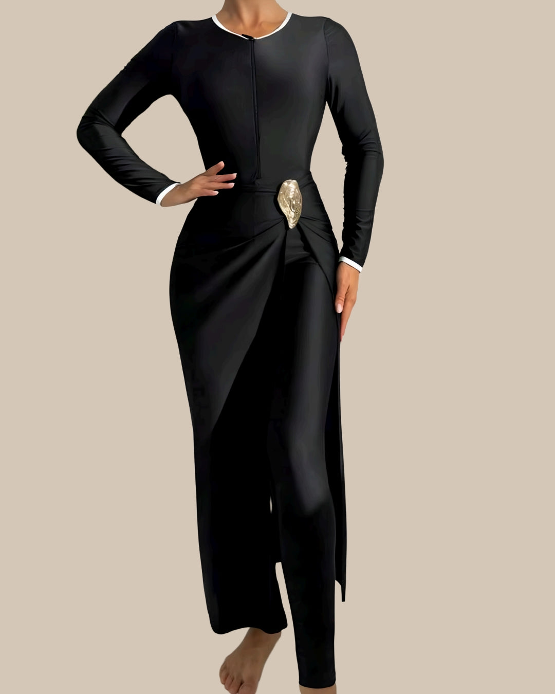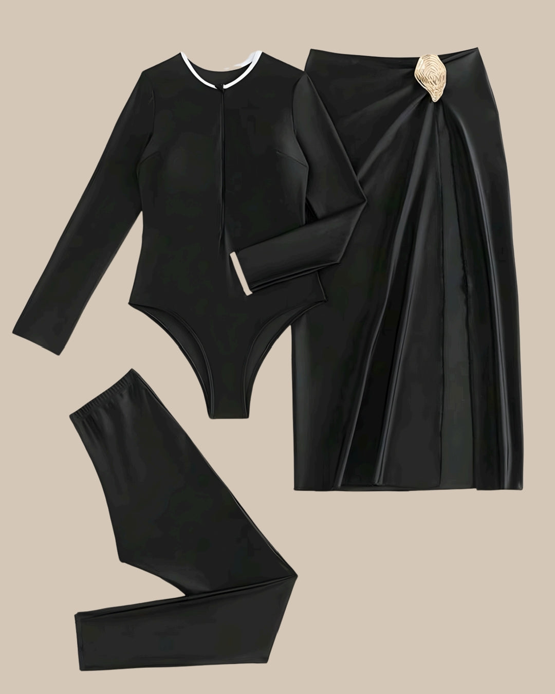 The Midnight Shores modest swim set blends sophistication with comfort. This 3-piece design includes a long-sleeve zip-up top, full-length leggings, and a draped wrap skirt detailed with a gold statement clasp. Crafted for confident, modest style that flows seamlessly from beach to resort.