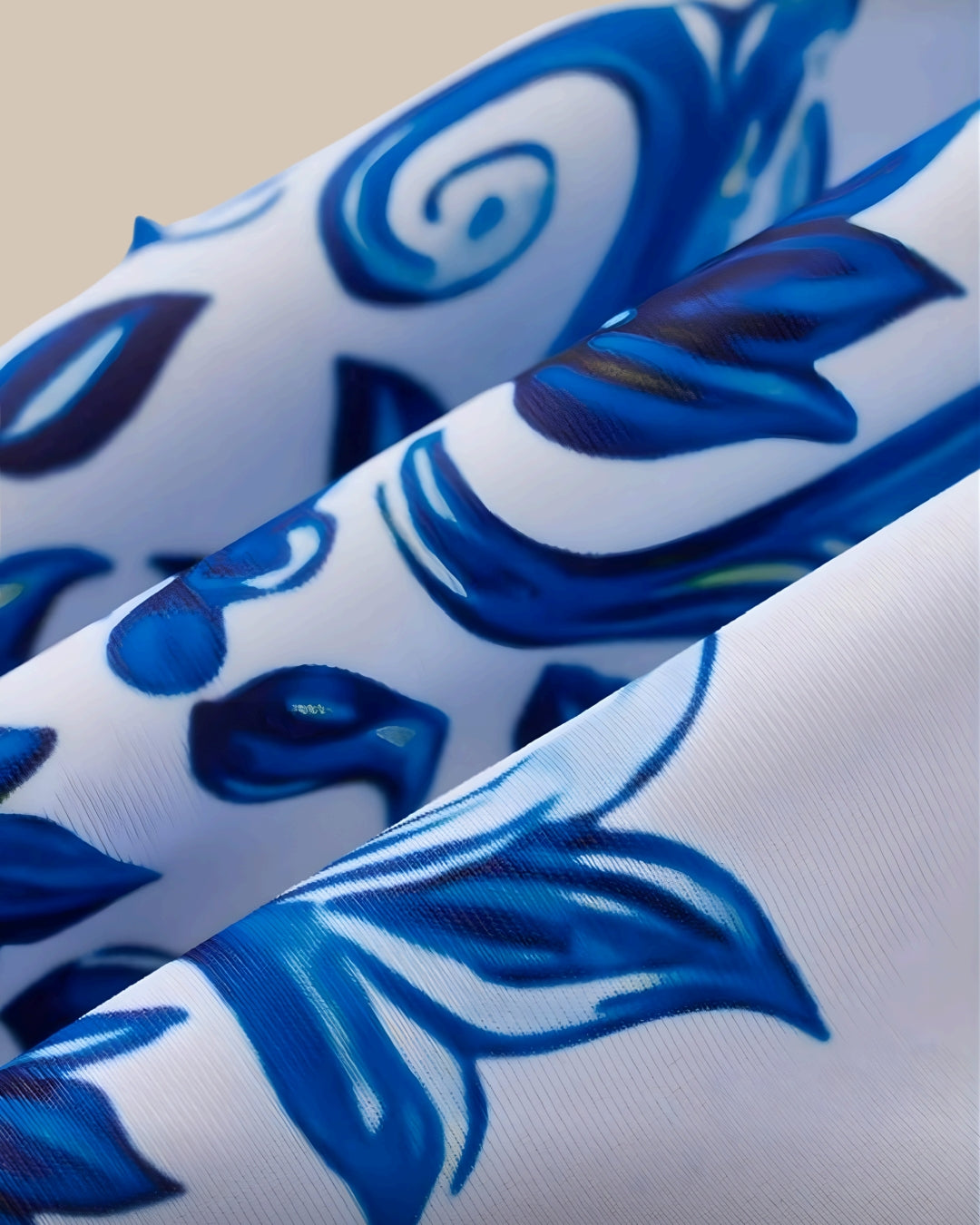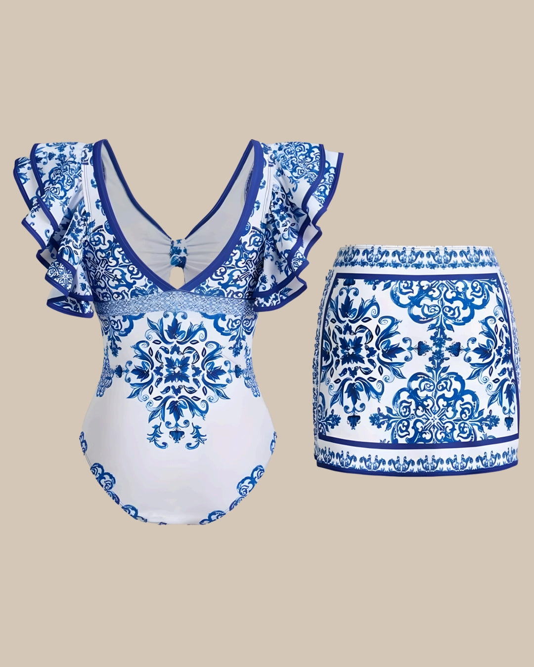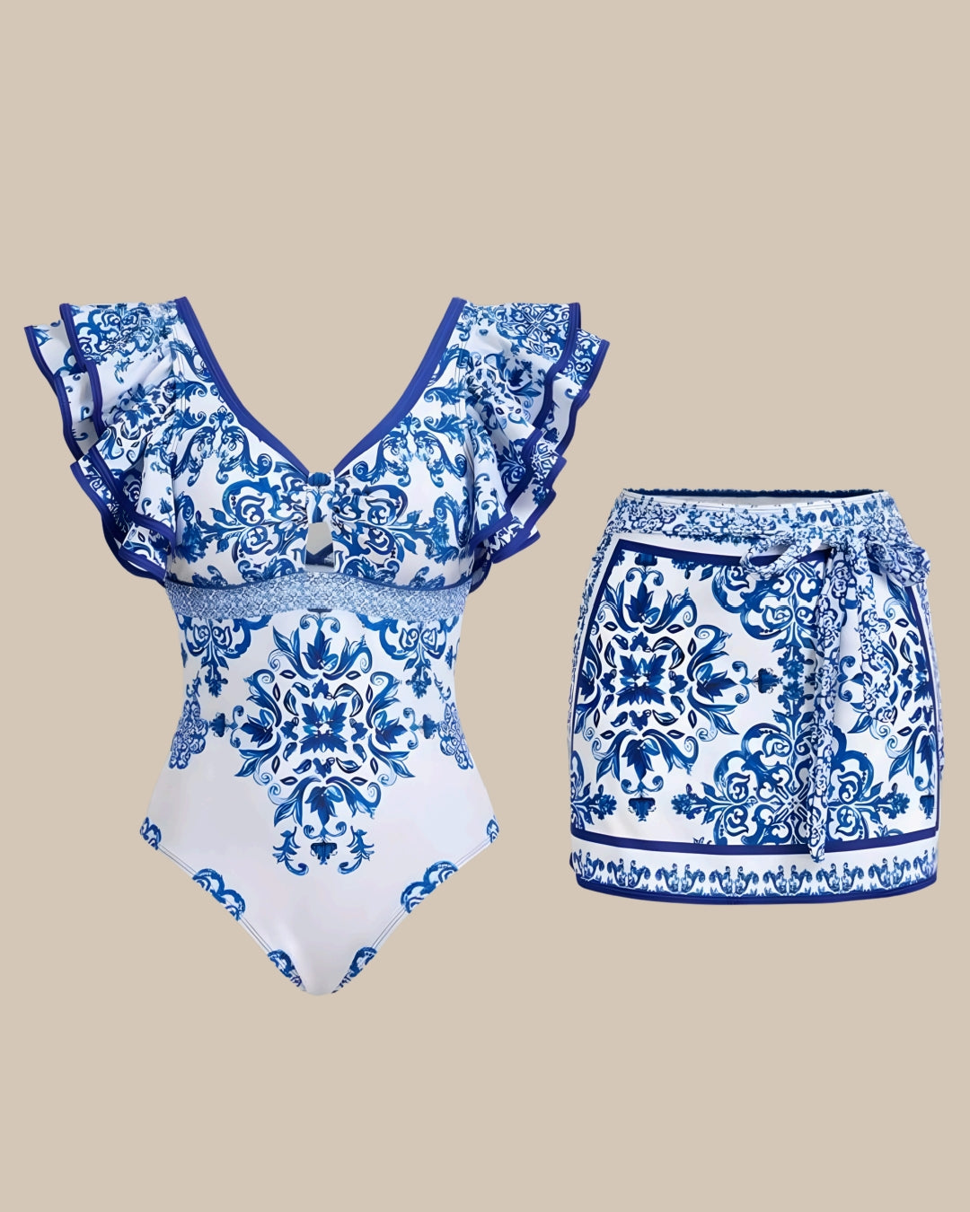 Inspired by the timeless beauty of the Greek islands, the Santorini Bloom Set combines elegance with comfort. This 2-piece swimwear set includes a ruffle-detailed one-piece swimsuit and a matching wrap skirt, both adorned in a striking blue-and-white print. Designed for those who love a modest yet effortlessly feminine beach look.