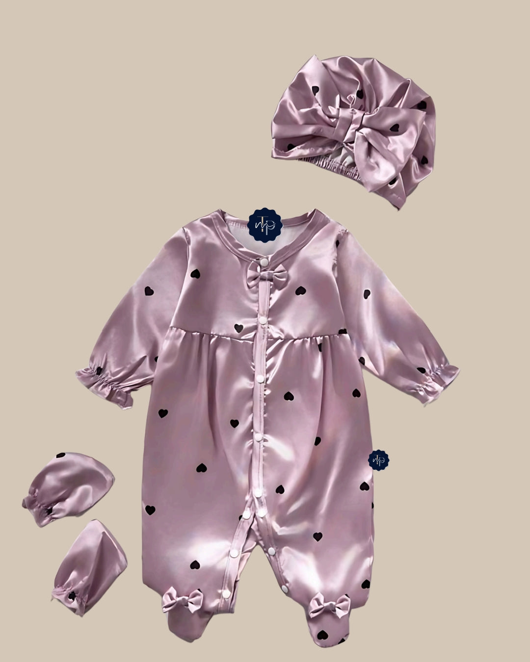 The Sweetheart set is crafted in soft satin with delicate heart detailing, bringing together luxury and charm for your little one. This beautiful 3-piece ensemble includes a button-down romper, matching mittens, and a statement bow bonnet. Designed for comfort while looking oh-so-stylish, it’s perfect for special occasions, keepsake photos, or as a thoughtful gift.