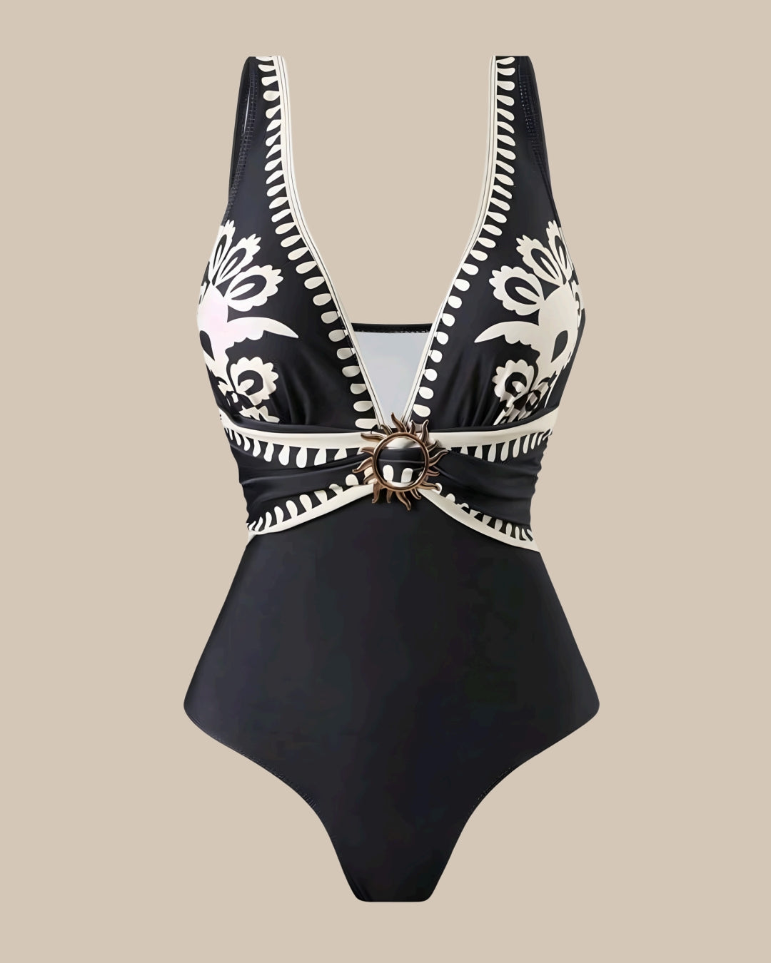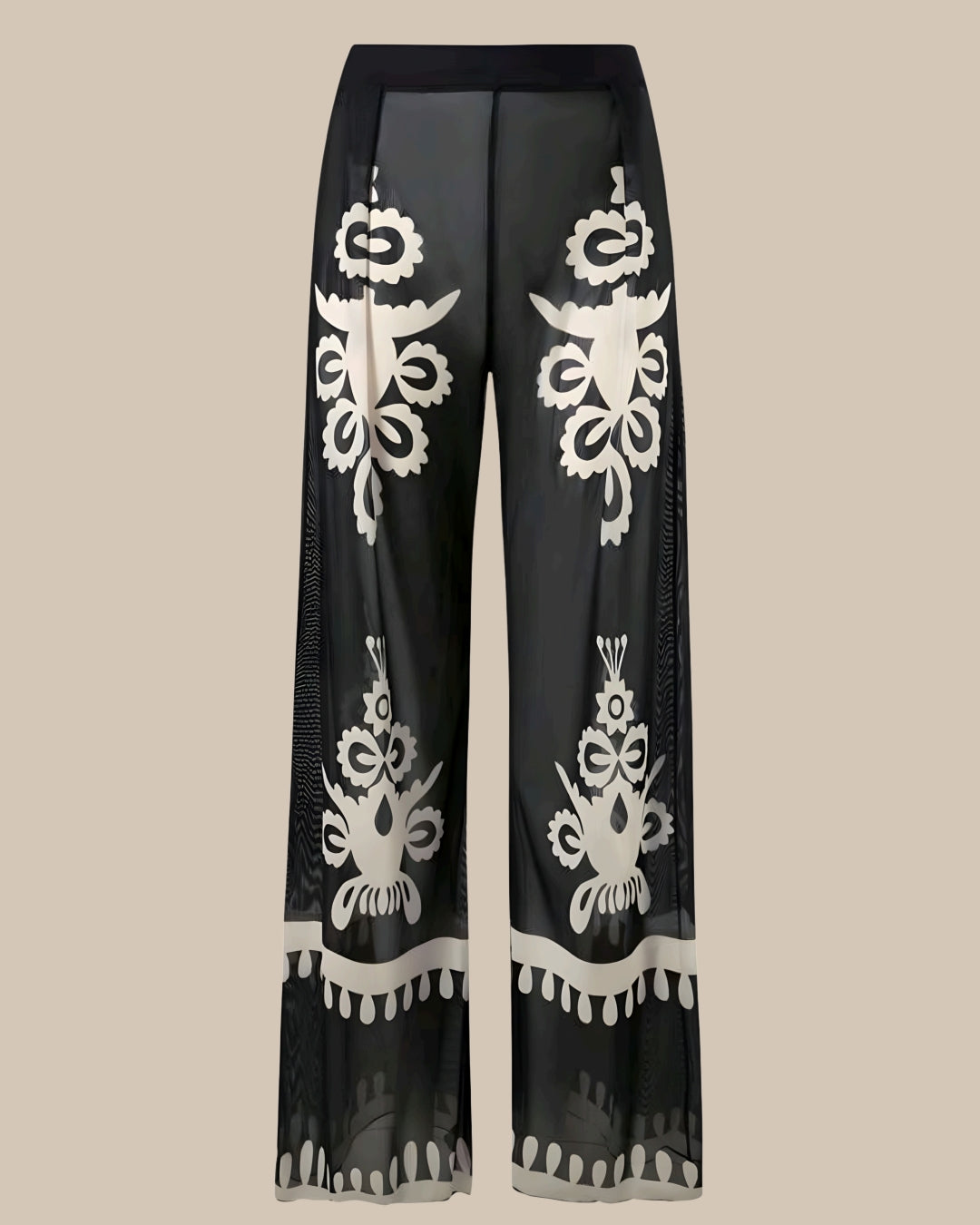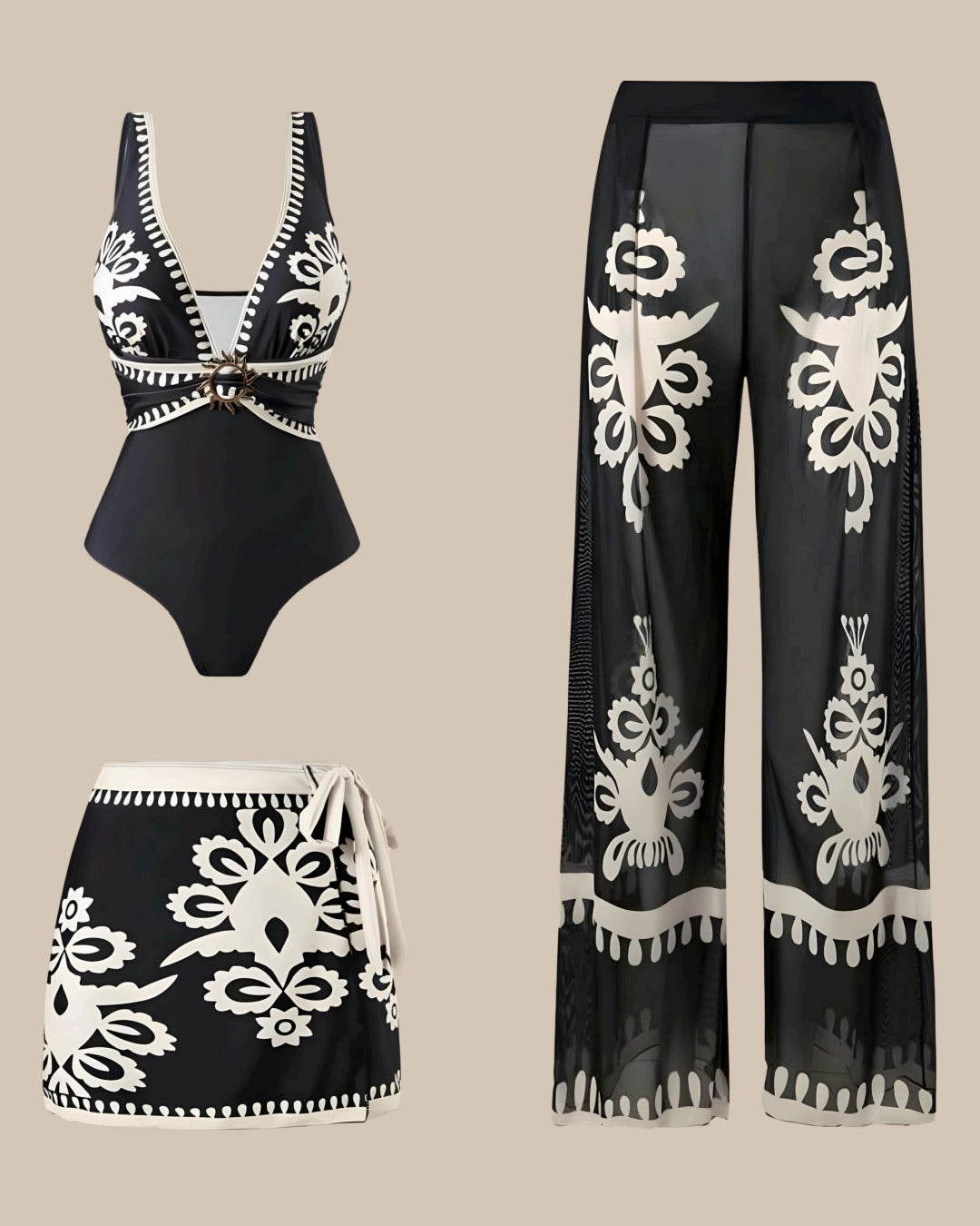 Make waves with the Zanzibar Nights 3-piece swim set, designed for the modern island muse. Featuring a statement one-piece swimsuit, matching sarong skirt, and sheer wide-leg cover-up pants, this look blends comfort and allure in perfect balance. Ideal for beach escapes, tropical holidays, or chic resort lounging.